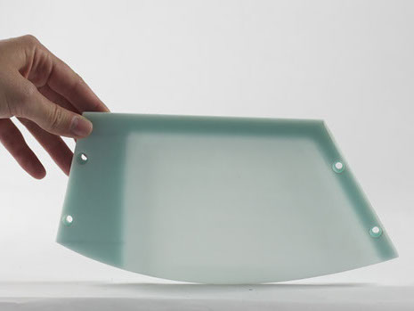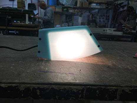 The Corian plates are fastened to the steel with cap screws. The lamp houses a short tubular incandescent light bulb and has a dimmer switch on the cord.